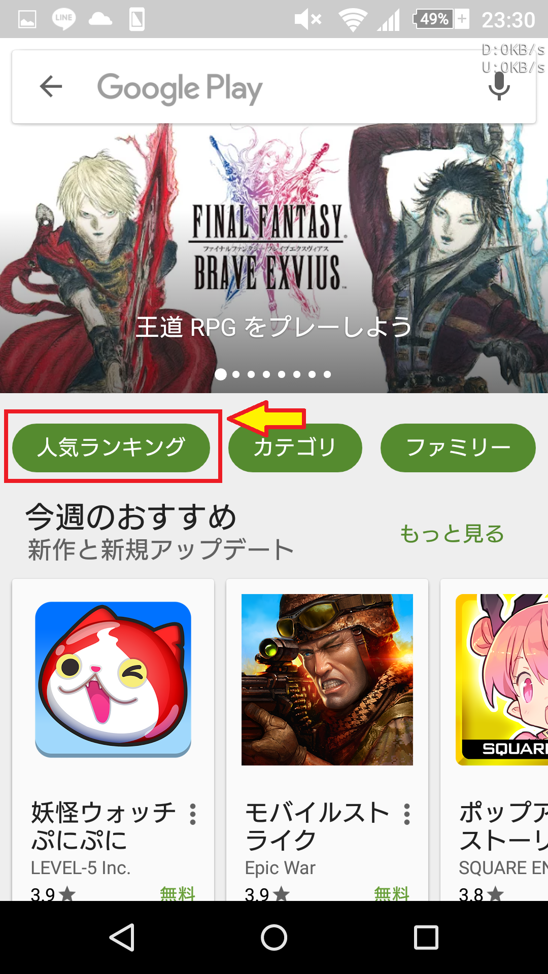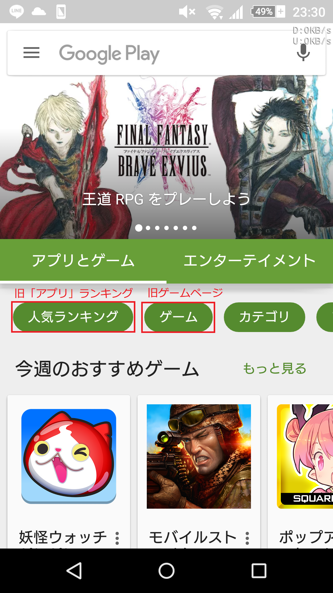 トップ画面にある「人気ランキング」を押すとゲーム・ツールごちゃ混ぜの旧「アプリ」におけるランキングと同等のものが出ます。