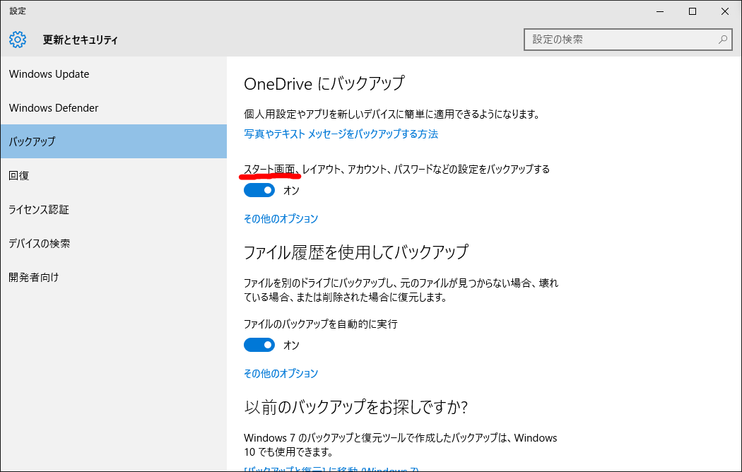 OneDriveにバックアップする設定のところに、