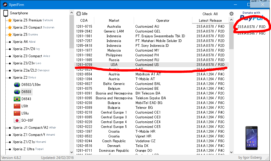 3.XperiFirmからXperia Z2→D6503を選択、23.5.A.0.570のもの(もしくはそれより新しい物)をDLしましょう。ここでは1281-9709 USA Customized USを推奨します。中ペインから種別を選んだ後、右ペインからバージョンをクリックしちゃいましょう。