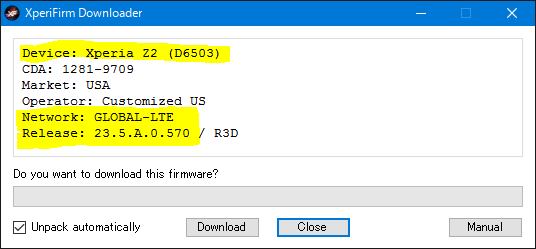 4.黄色く塗った所が一致しているか確認してください。バージョンに関しては、同じか、より新しい物であるかを確認してください。Xperia Z2(D6503)、GLOBAL-LTE、23.5.A.0.570もしくは最新バージョン、という3点です。大丈夫であれば、Downloadを押して暫く(通常光回線15分前後)待ってください。