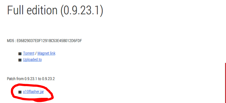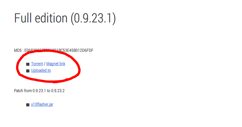 Torrent、Magnet link、Uploaded.toのどれかを押すと0.9.23.1がDL出来ます。Uploaded.toは超遅い(下手すると2時間かかる)ため、Torrentが使える人は最初の2つどちらかを選択したほうが良いでしょう。Torrentはピアトラッカー接続情報を.torrentファイルに収めたものがDLされますので、その.torrentファイルを適切なクライアントで読み込むと、Flashtool本体がDLされます。Magnet linkは適切なクライアントがあれば直でDLできるリンクです。