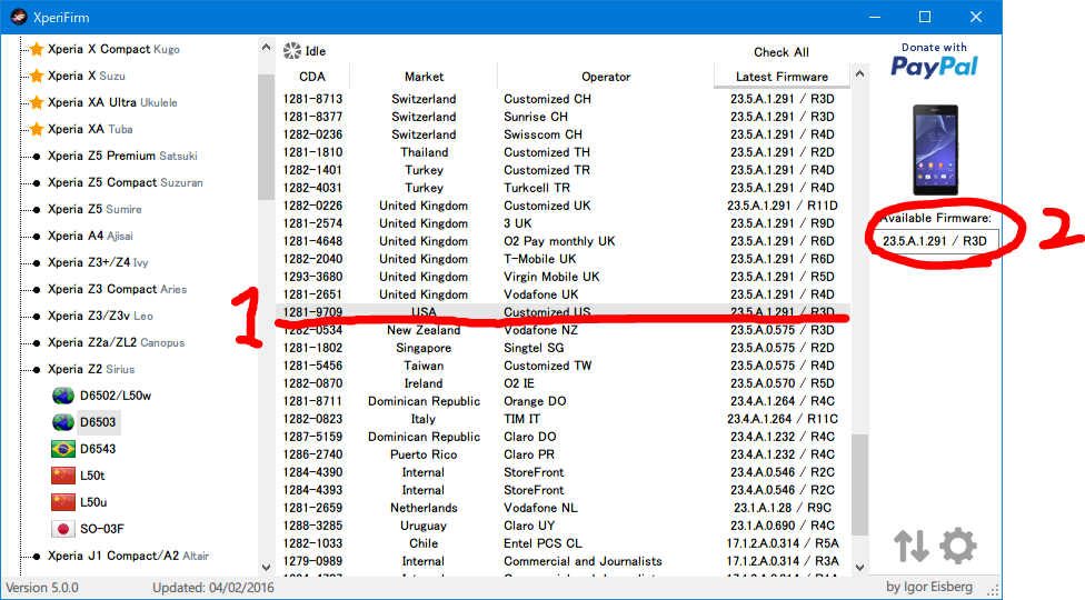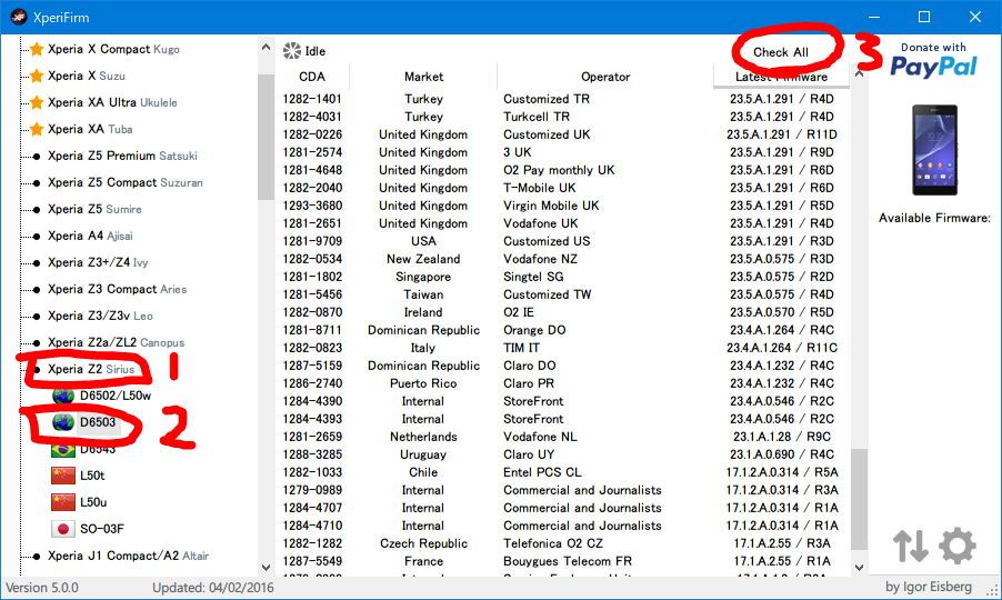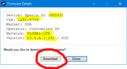 2-3. Xperifirmが立ち上がりますので、以下の通りに操作して適切なROMをDLします。