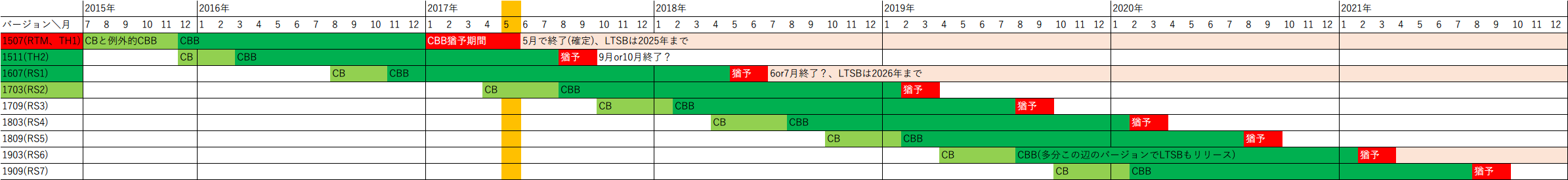 今後3月、9月のリリースが予定通りに行われた場合1709のCBBリリースを2018年2月と想定すると1607のサポートがその時点で切れるのではないでしょうか。横長の表では2018年5月となってるのは何か理由があるのでしょうか。